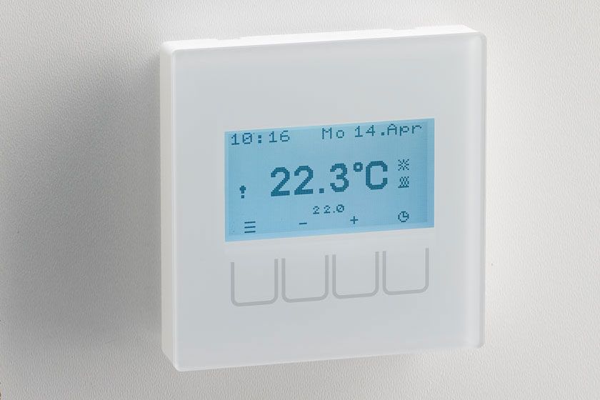 The control panel with integrated room temperature sensor allows control of the heater and also displays the current operating status. In addition, all measured values ​​of the controller can be displayed.The control panel has a graphic display and capacitive buttons behind a plexiglass front.It is connected via a 4-pin bus cable to the controller and supplied by this power.